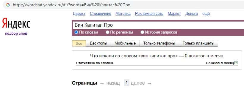 - Количество запросов по бренду Вин Капитал Про в поисковике Яндекс