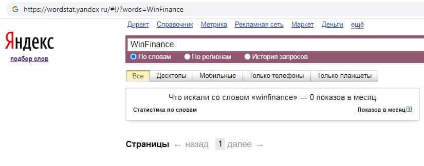 По количеству запросов по бренду названия компании на английском языке без пробела "WinFinance" на wordstat yandex ru данные отсутствуют.