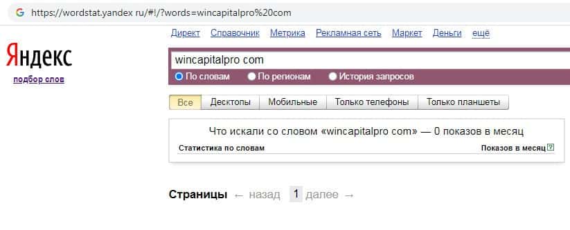 По количеству запросов по бренду названия домена сайта с точкой "wincapitalpro.com" на wordstat yandex ru нет никаких данных.