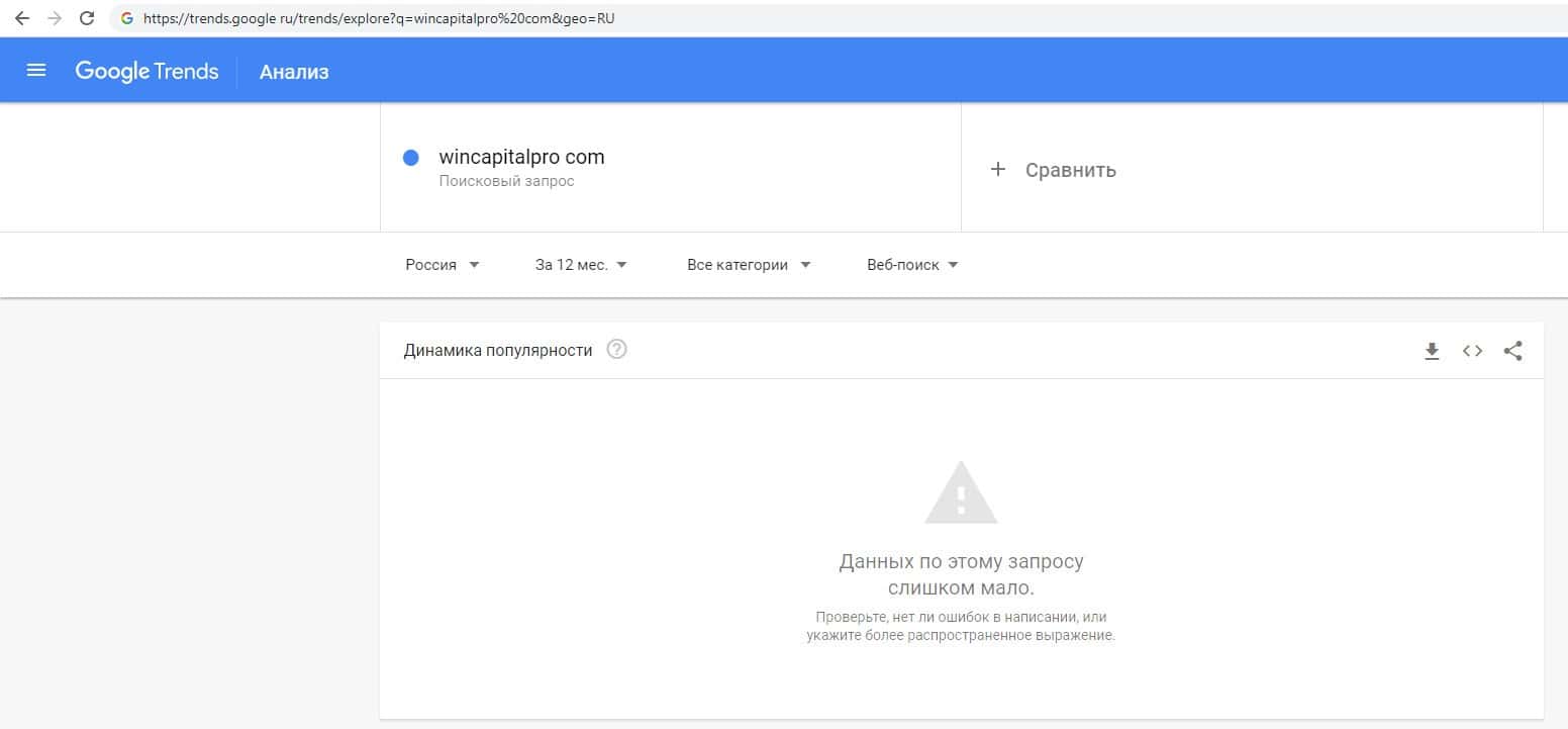 По количеству запросов по бренду названия домена компании без точки "wincapitalpro com" на Трендс Гугл Ру информация отсутствует.