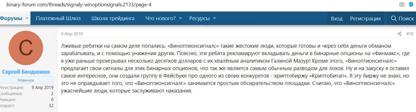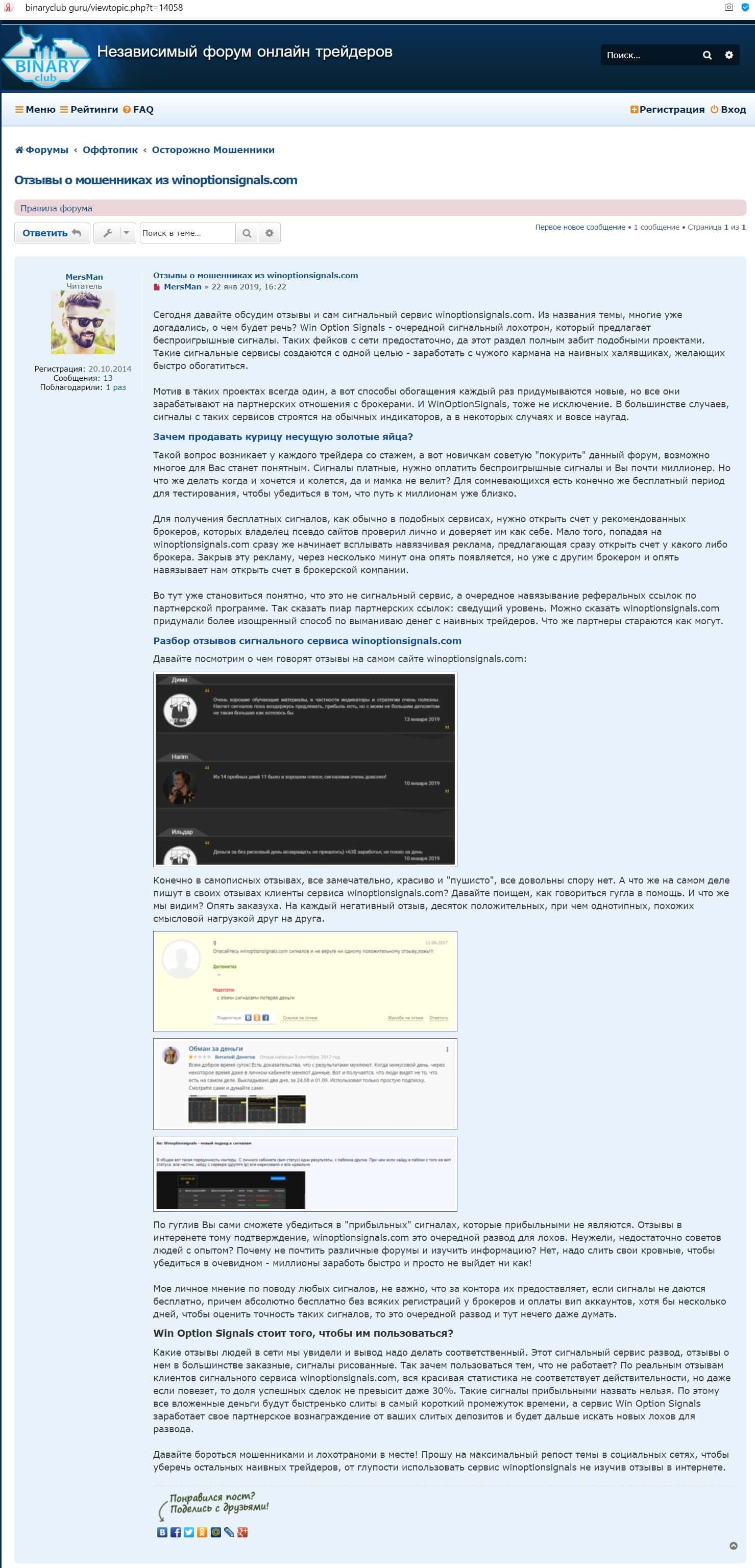 Молодой человек написал комментарий на форуме, где говорит, что он не заработал на сайте Вин Опционс Сигналс и 1%, все отзывы у них самописные, статистика фальшивая.