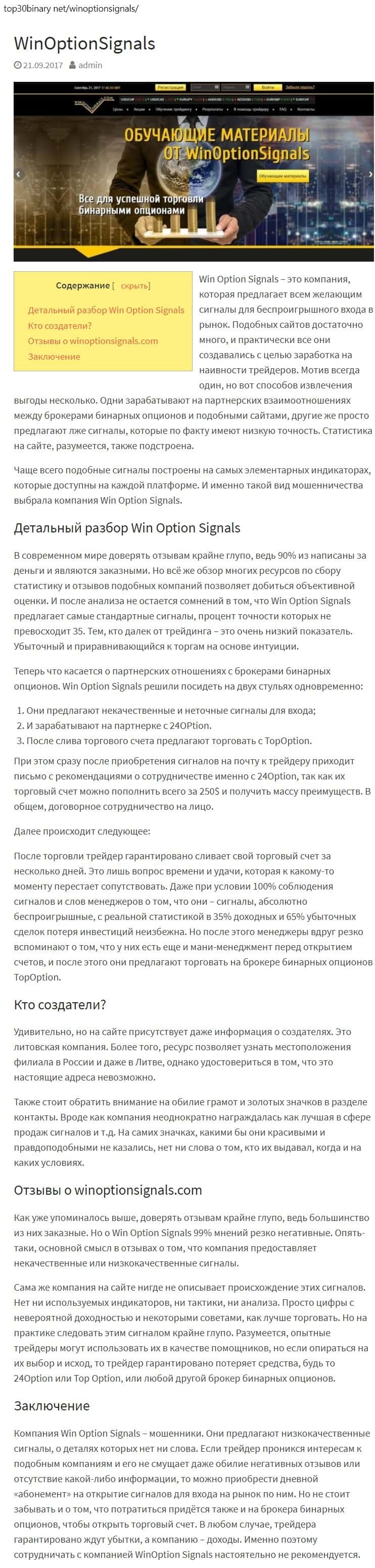 Сайт top30binary net рассказывает в своей статье о жуликах Вин Опционс Сигналс, как они продают фальшивые сигналы и заводят людей на сайты к черным брокерам.