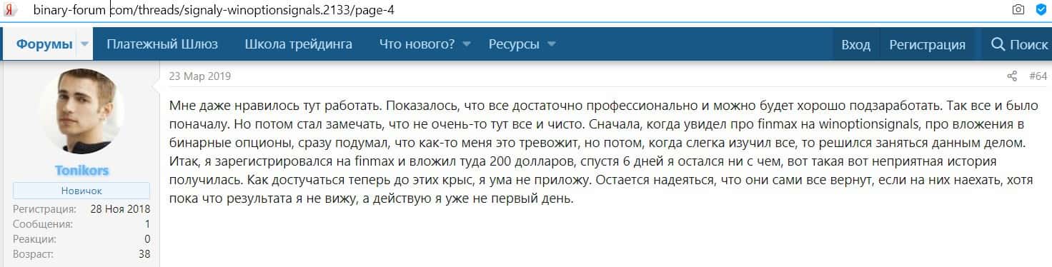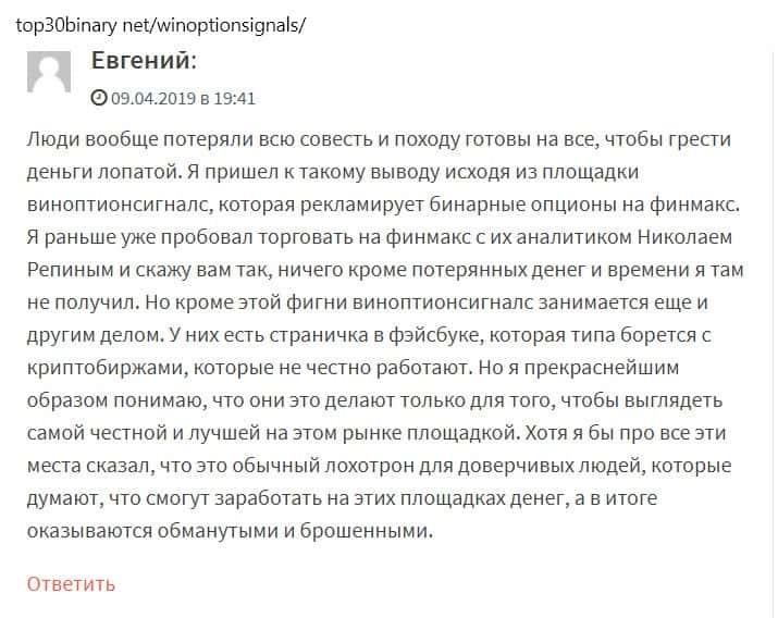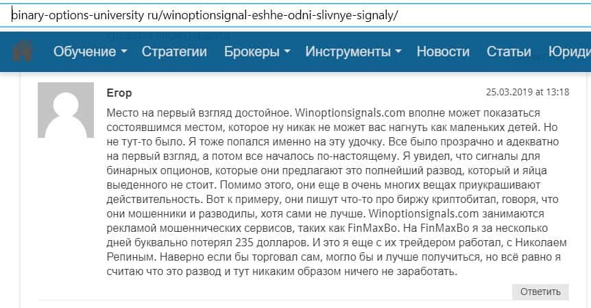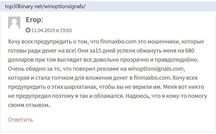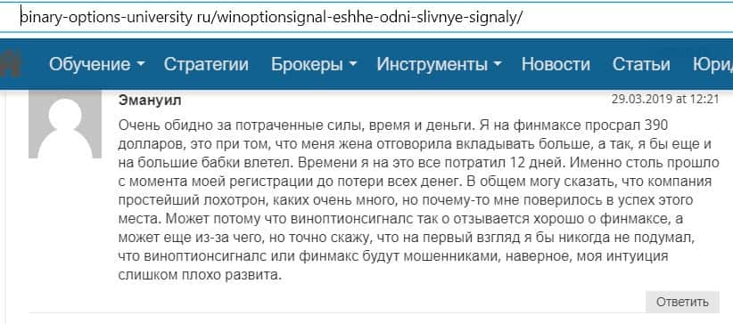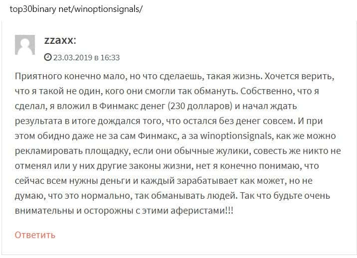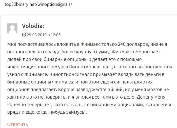 Володя оставил отзыв, что прочитал на сайте WinOptionSignals о лохотроне Фин Макс и потерял там деньги. Это жесточайший развод, на который способны только жулики.