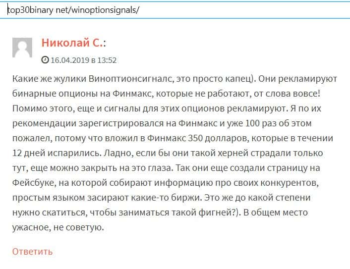 Николай написал отзыв о конторе WinOptionSignals, что он потерял на сайте Фин Макс, которых рекламирует эта шарага, 350 долларов. Их сигналы не работают, все лохотрон!