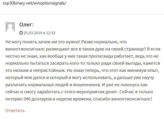 Олег пишет, что также, как и другие клиенты конторы WinOptionSignals, потерял деньги и время. Он связался с псевдоброкером, которого рекламирует данный лохотрон.