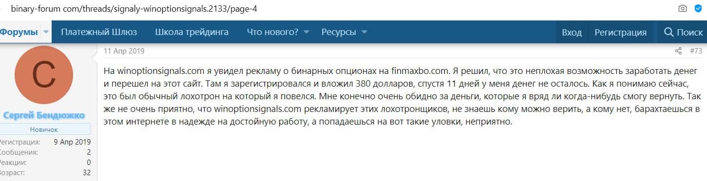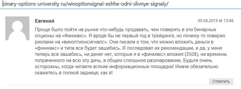 Еще один пользователь рассказал, как его кинула контора Фин Макс, с которой сотрудничает Вин Опционс Сигналс. Сплошное разочарование от этих сайтов!