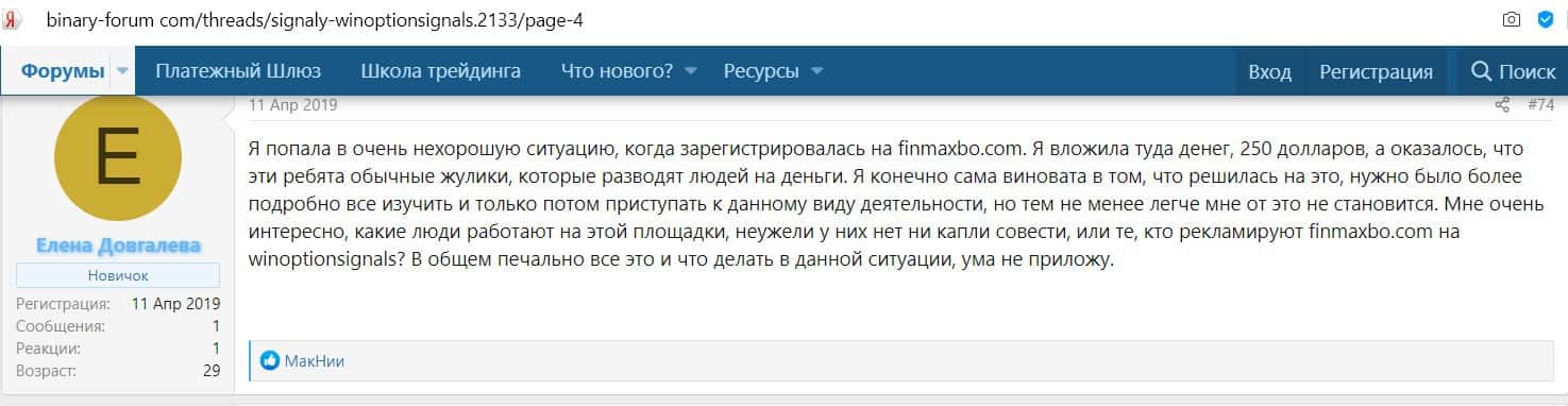 Отзыв Елены говорит о том, что нельзя доверять кому попало, начиная торговать с незнакомым брокером. В данном случае это Вин Опционс Сигналс и Фин Макс.