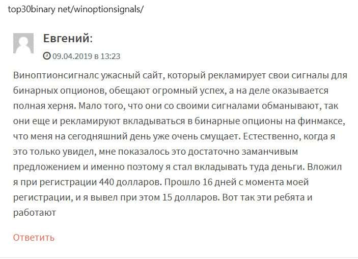 Евгений написал отзыв, что сайт WinOptionSignals - ужасный, их сигналы вообще не работают. Он вложил 440 долларов, а вывел 15. Полное вранье и беспредел!