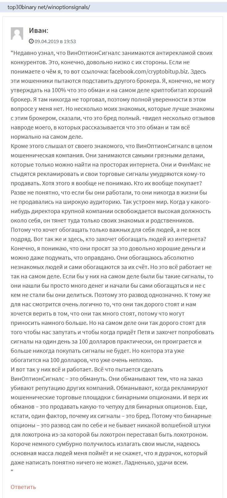Клиент конторы Вин Опционс Сигналс, которого она кинула на деньги, говорит, что они продают фальшивые сигналы, а кроме того, поливают грязью конкурентов.
