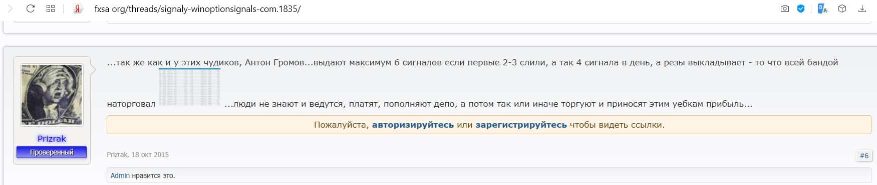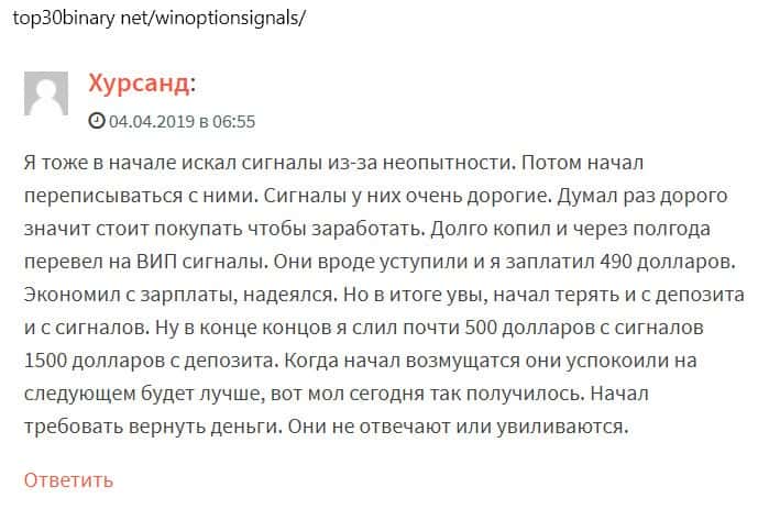 Хурсанд пишет, что покупал дорогие ВИП сигналы на площадке WinOptionSignals в надежде заработать, но они себя не оправдали, так как он слил большую часть депозита.
