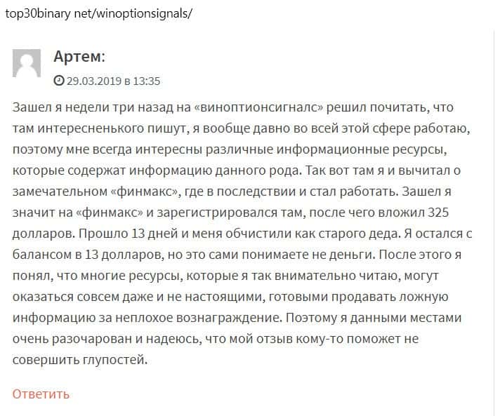 Артем рассказал, что, благодаря рекламе на сайте WinOptionSignals, он потерял деньги. Но главное не это, а доверие, которого он теперь лишился из-за вот таких врунов.