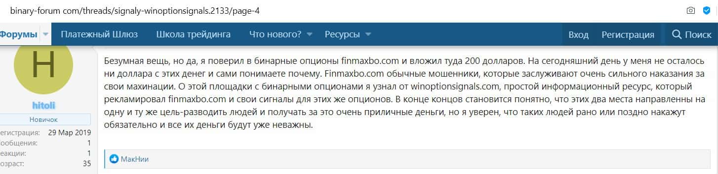 Другой пользователь говорит, что он понял: две конторы, сотрудничающие друг с другом, это Вин Опционс Сигналс и Фин Макс вместе ищут жертв и сливают депозиты людей.
