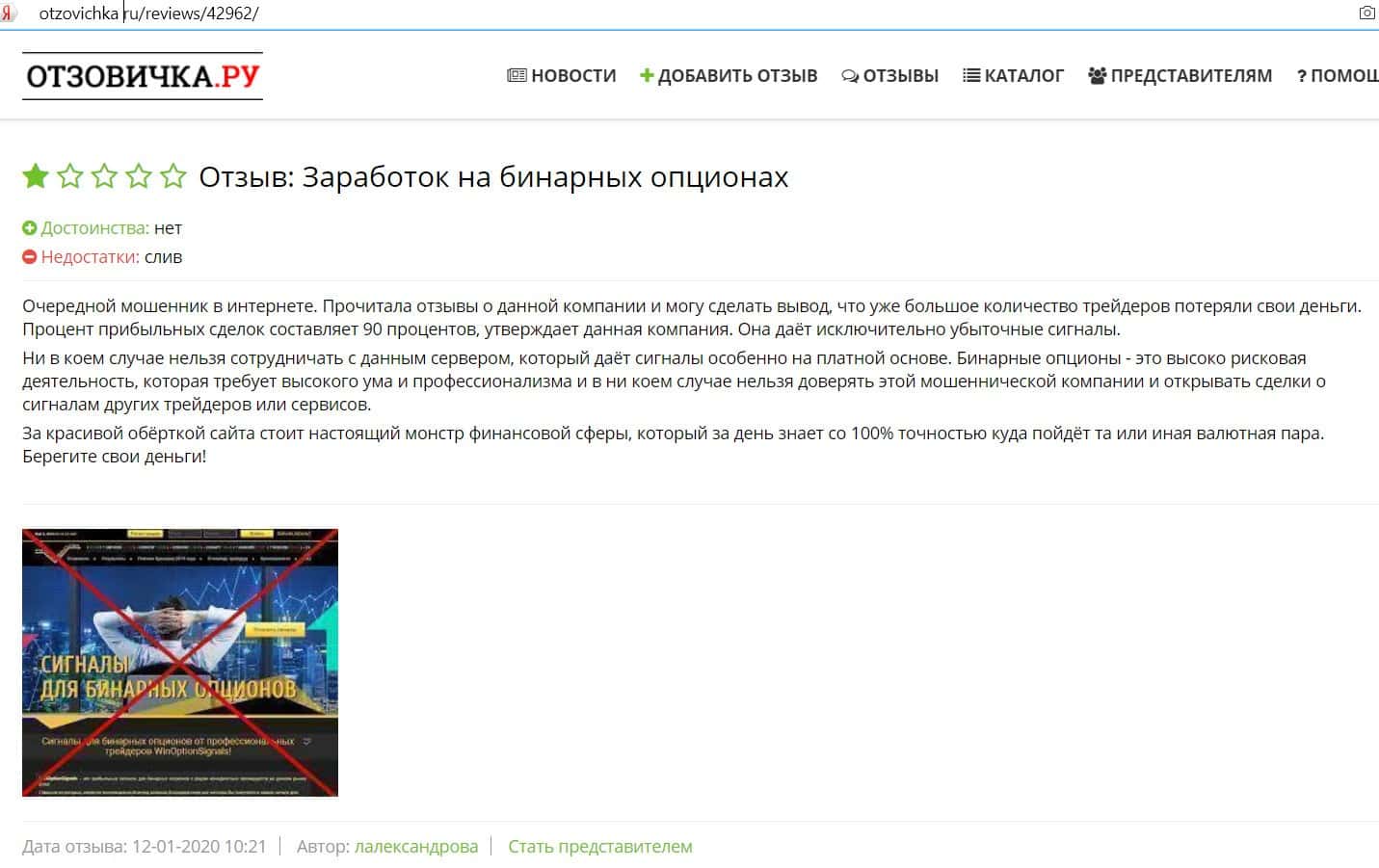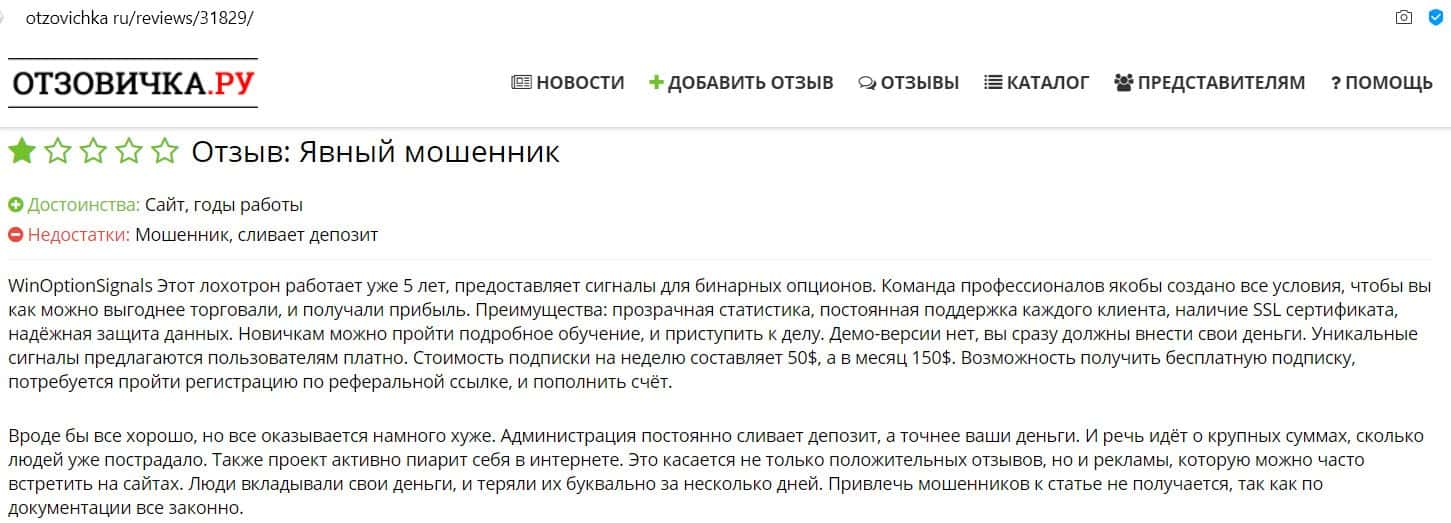 На сайте Отзовичка появился отзыв о том, что вроде бы у брокера Вин Опционс Сигналс все хорошо, но это только на поверхности, в реале все там только теряют депозиты.