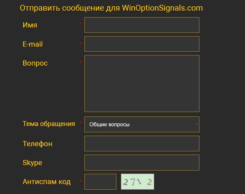 Также пользователи могут заполнить форму обратной связи на сайте Вин Опционс Сигналс, которую используют для сбора информации о клиентах.