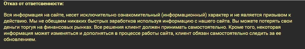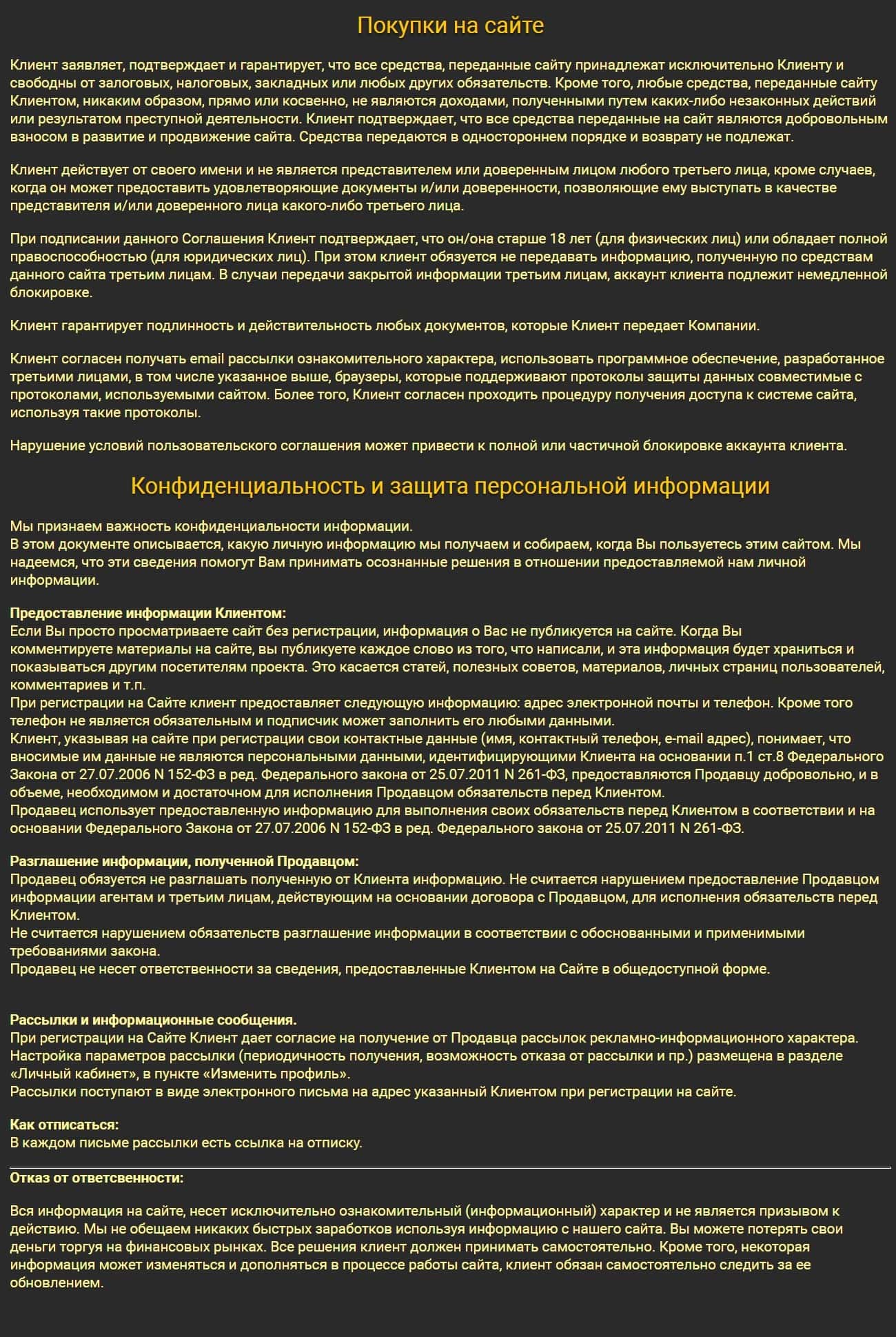 В последнем пункте договора с клиентом компания говорит, что вся информация на сайте носит ознакомительный характер, никто не утверждает, что здесь можно заработать.