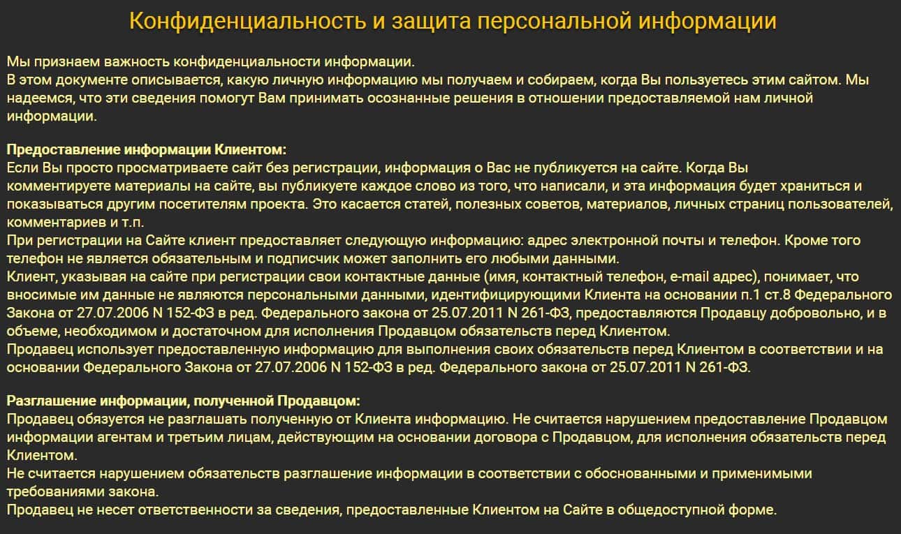 В договоре компании Вин Опционс Сигналс имеется раздел о конфиденциальности данных клиента, где говорится о важности хранения информации о пользователе.