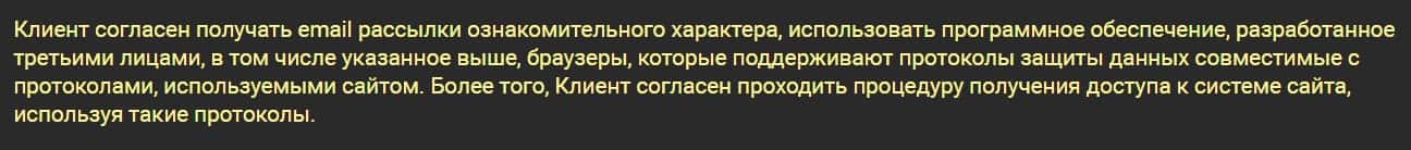 Далее идет пункт о том, что клиент согласен получать рассылки от сайта Вин Опционс Сигналс (то есть, спам) и использовать их программы, ведущие к сливу депозита.