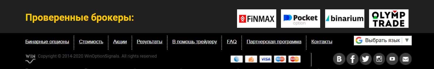 Контора Вин Опционс Сигналс связана с черными брокерами Фин Макс, Покет Опцион, Бинариум, Олимп Трейд, кидающими людей на деньги. Их реклама есть на сайте.