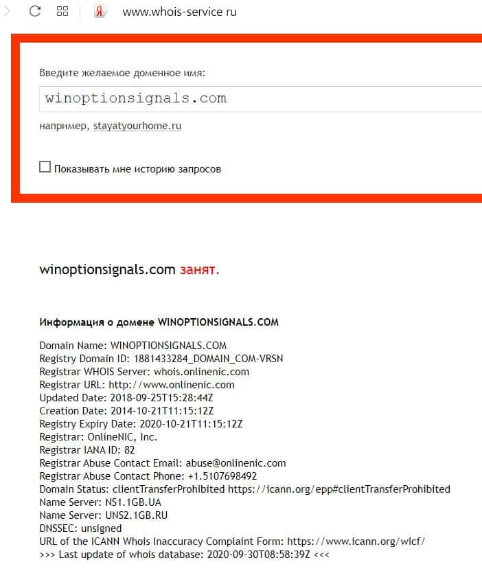 Кому принадлежит доменное имя сайта winoptionsignals com?