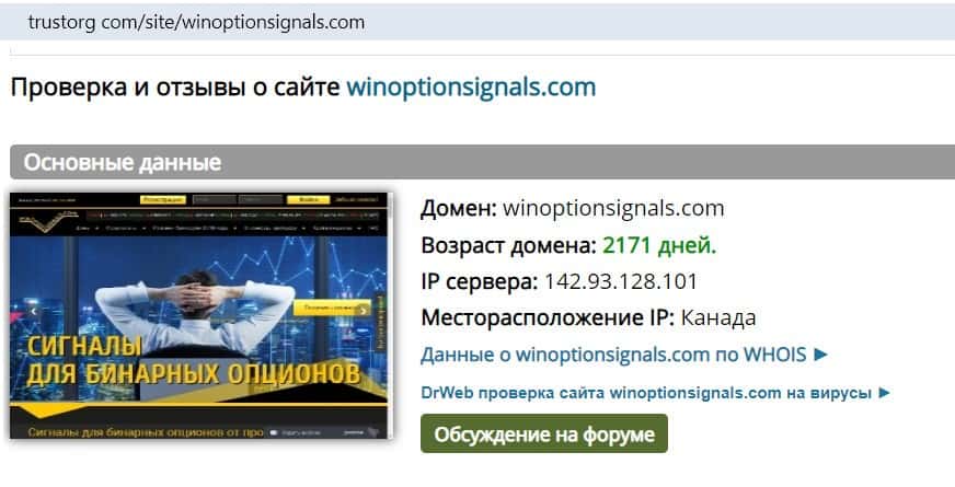 Возраст доменного имени сайта winoptionsignals com составляет 2171 дней. Судя по данным сайта Трасторг, контора уже длительное время разводит пользователей.