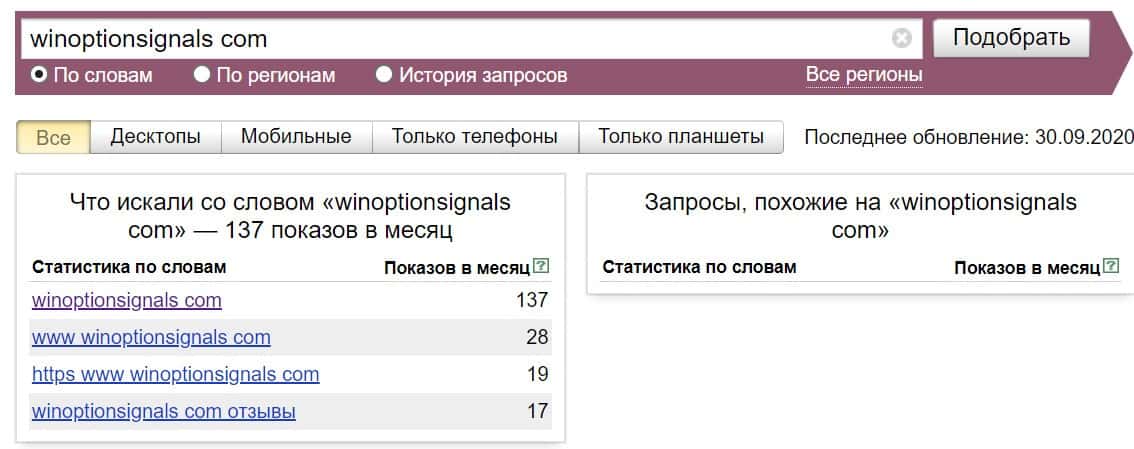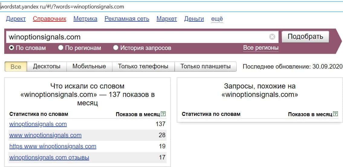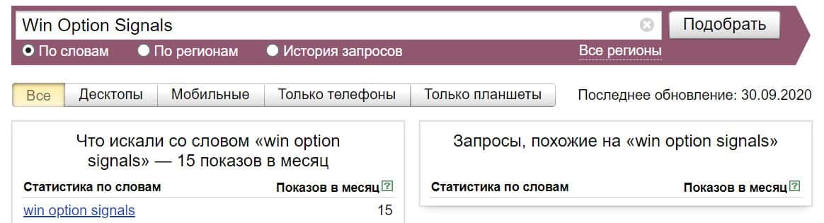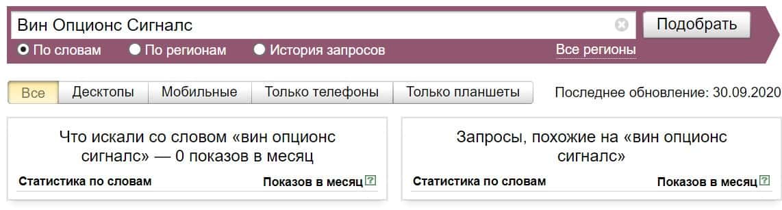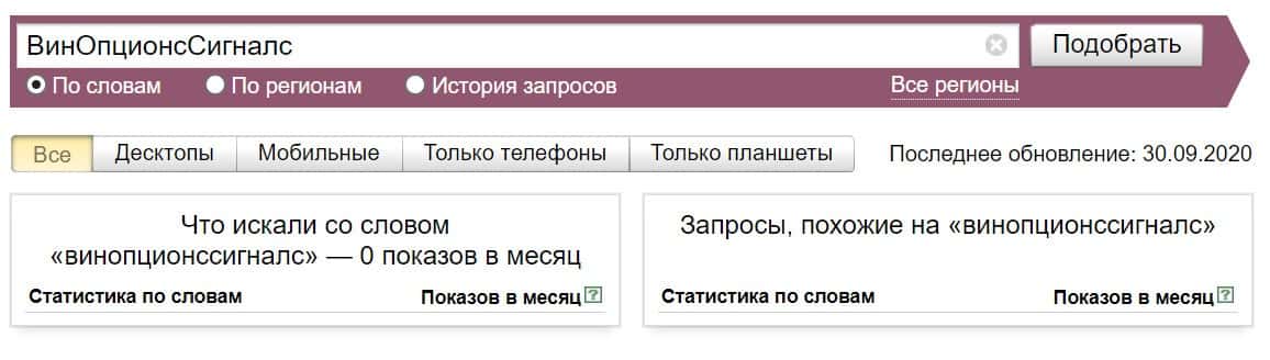 Посмотрим, сколько раз люди искали название бренда "Вин Опционс Сигналс" на русском языке с пробелом: результат 0 показов.