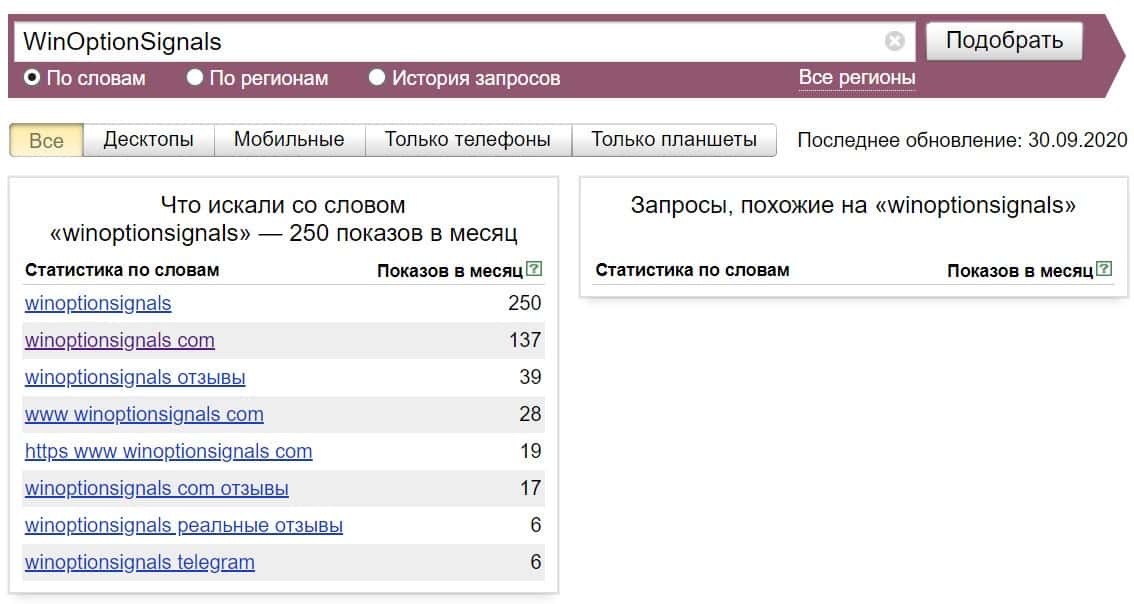 Название мошеннической конторы "WinOptionSignals", написанное на английском языке, пользователи искали в системе Яндекс не очень часто - всего лишь 250 показов.