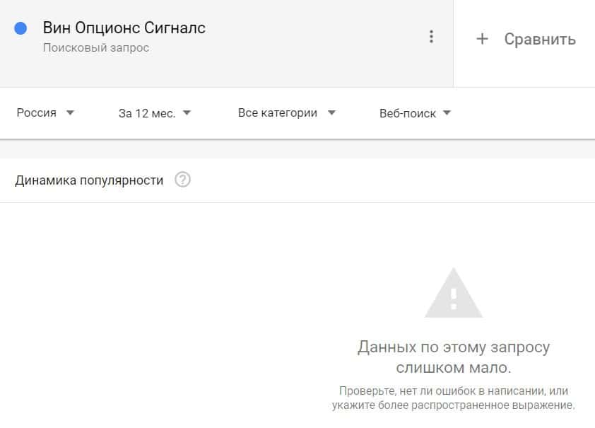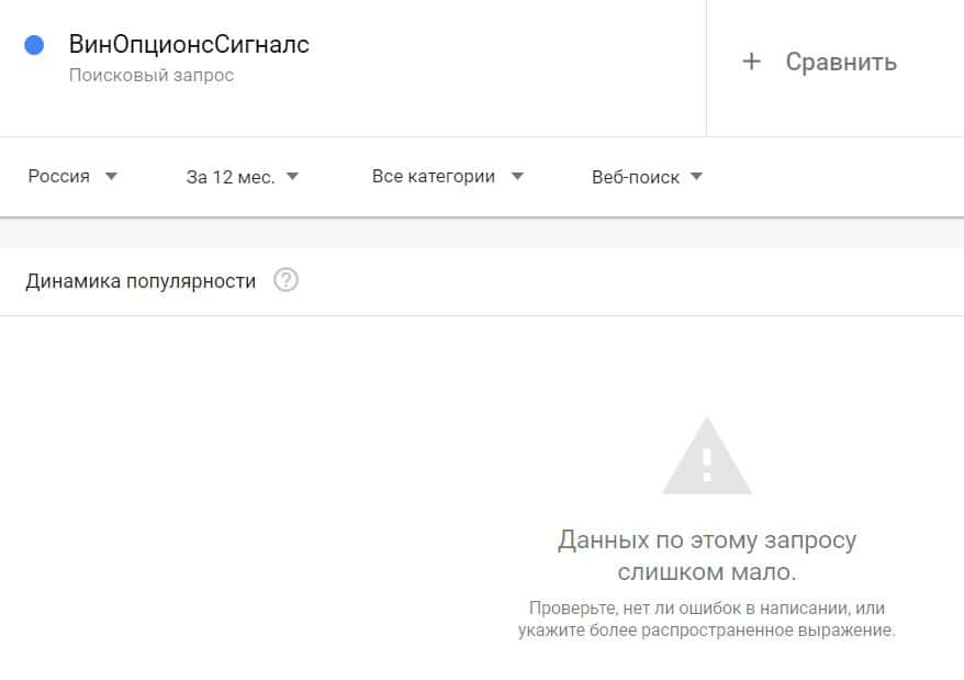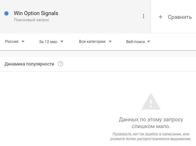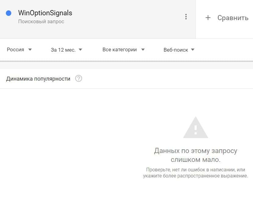 Посмотрим, насколько популярно название бренда "WinOptionSignals", написанное на английском языке. Данных по этому запросу нет, так как никто не искал этот бренд в Гугл.
