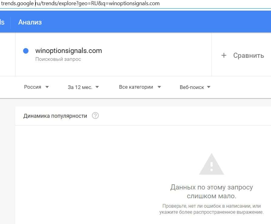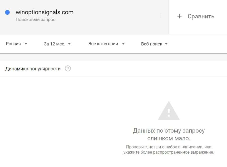 Доменное имя мошеннического сайта "winoptionsignals.com" вбивали в поисковую систему Гугл слишком редко, поэтому данных по этому запросу практически нет.