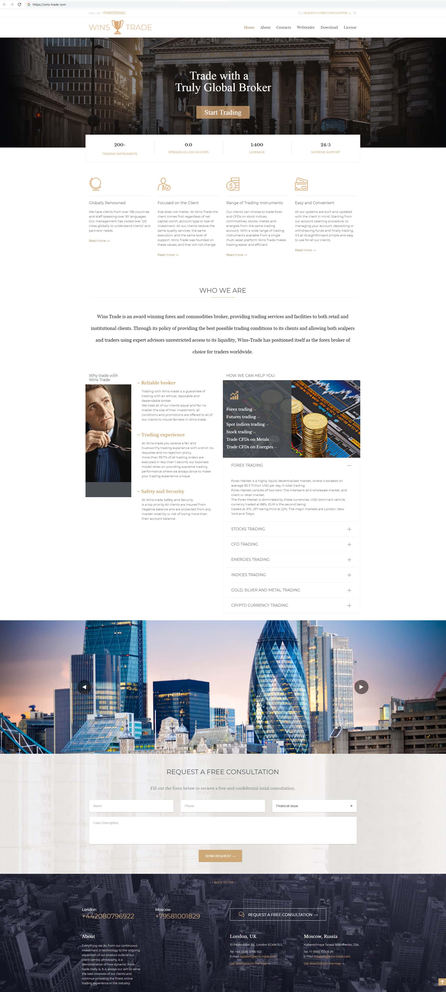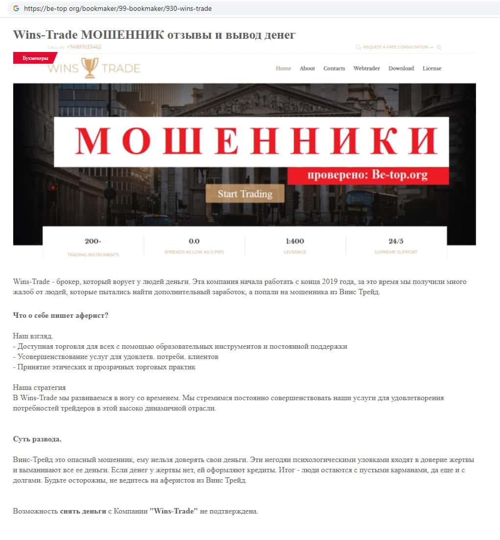 В данном разделе предлагаем увидеть скрин главной веб-страницы веб-ресурса псевдо-брокерской организации Wins-Trade, помните о том, что такие проекты очень быстро скамятся.