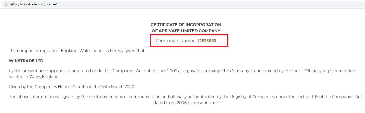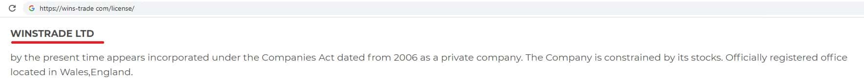 На сайте реестра компаний Великобритании есть информация о существовании такой конторы как Wins-Trade, но это не является гарантией наличия лицензии.