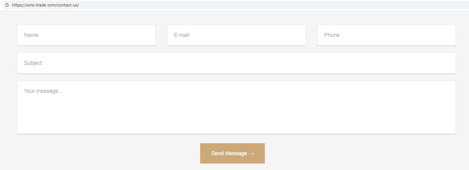 Мошенники Wins-Trade ведут сбор данных о посетителях своего дырявого сайта, просят указать свое имя, номер телефона, а также адрес электронной почты в качестве обратной связи.