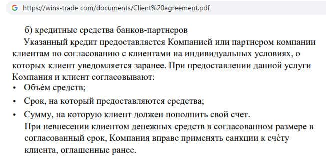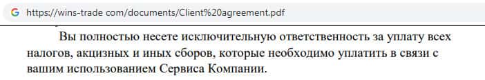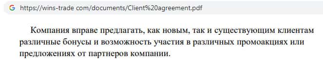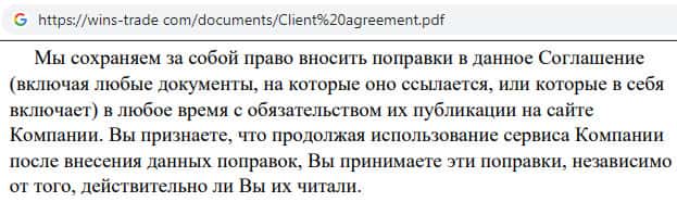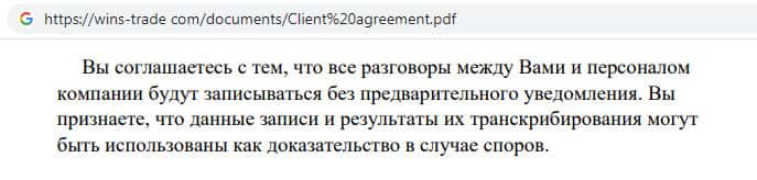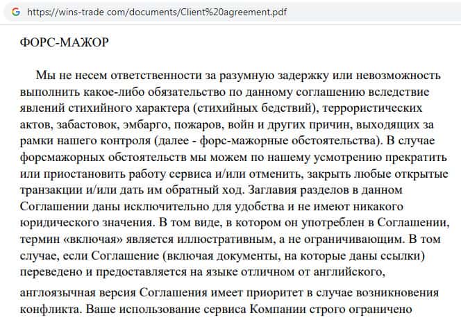 Клиентское соглашение мошеннической организации Wins Trade
