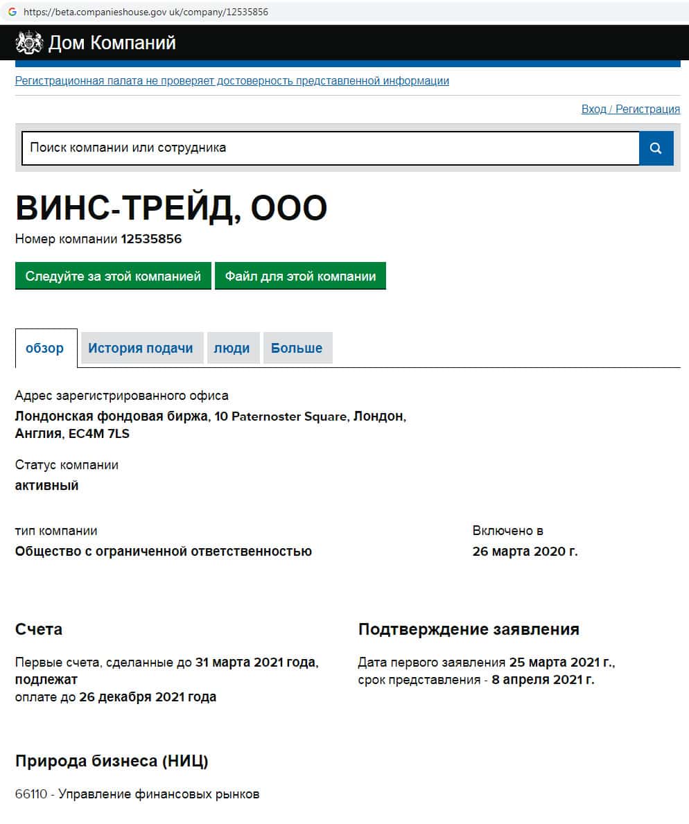 Сведения о месте регистрации Винс Трейд фальшивы, так как большинство мошеннических проектов у себя на сайте указывают адрес в Лондоне для приманки очередного лоха.