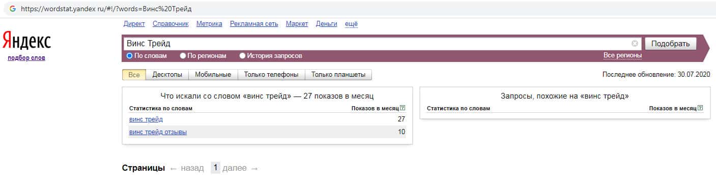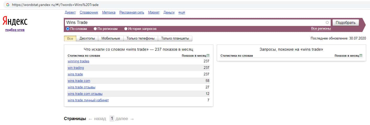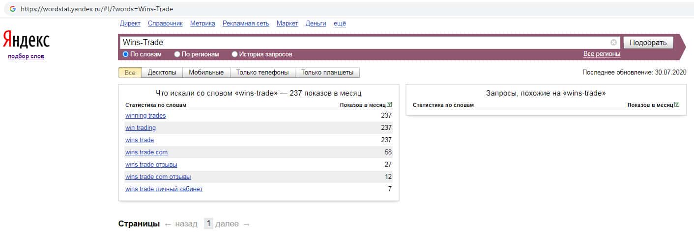По количеству запросов на бренд англоязычного названия компании с пробелом "Wins Trade" на wordstat yandex ru показатели такие же, а именно 237 показов за месяц.