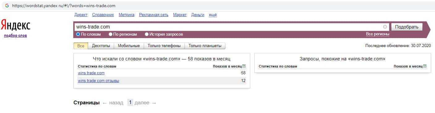 По количеству запросов по бренду названия домена без точки "wins-trade com" в поисковике Yandex тот же показатель, а именно 58 показов за месяц.