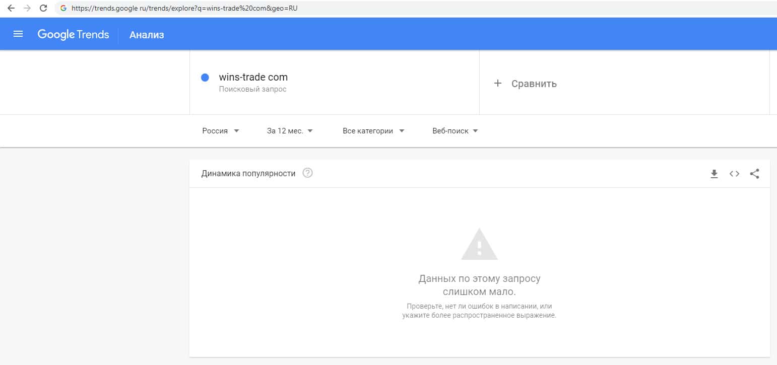 Количество брендовых запросов названия домена с точкой "wins-trade.com" на trends google ru вероятно равно нулю.