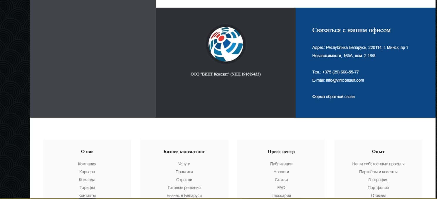 Завершается сайт у жулья VintConsult вполне ожидаемо, а именно информацией о том, что шулера VintConsult предоставляют свои контакты, а так же ссылками на различные разделы сайта мошенников ВИНТ Консалт. На изображении, расположенном ниже, вы можете увидеть окончание подвального сайта аферистов VintConsult
