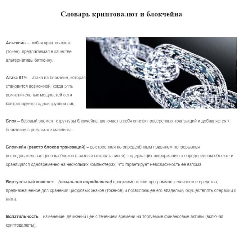 Следующим пунктом на сайте конторы VintConsult стоит словарь криптовалют и блокчейна, в котором также расписаны все основные понятия торговли, такие как альткоин, блокчейн, волатильность и другие расшифровки понятий, рассчитанные на начинающих или совсем не знающих в этой сфере пользователей.