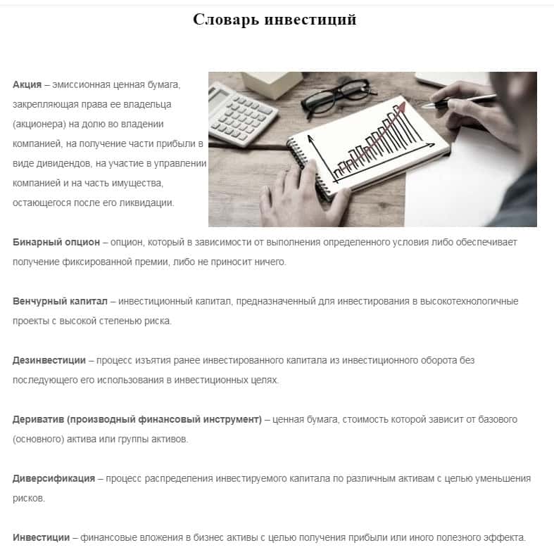 Еще дальше у подвальной конторы ВИНТ Консалт можно увидеть словарь инвестиций, который заполонен непонятными и красивыми словами, внушающими серьезность и доверие консалтинговой кухне VintConsult. Держитесь подальше от таких контор, чтобы сохранить свои средства и нервы.