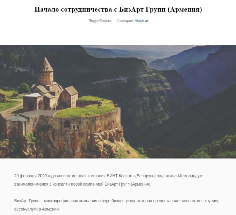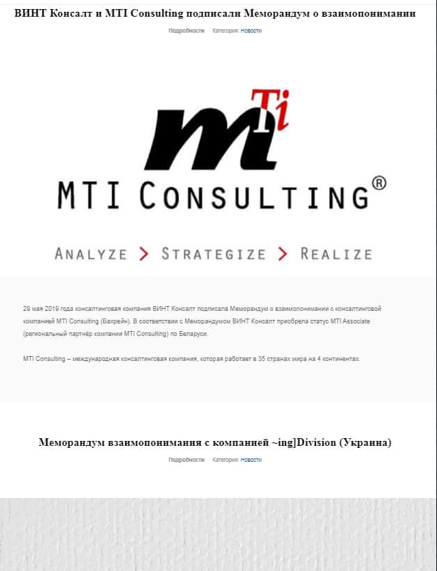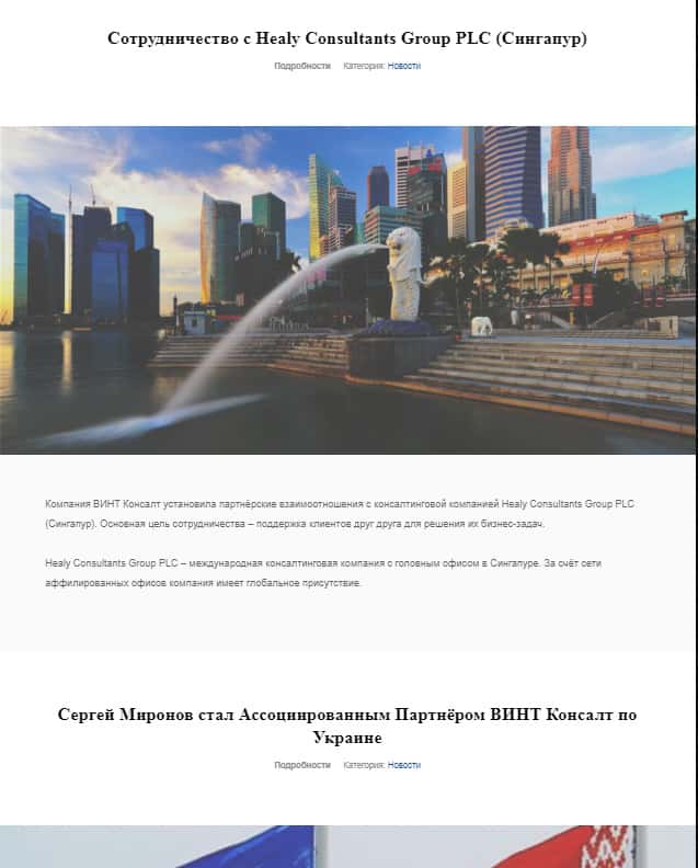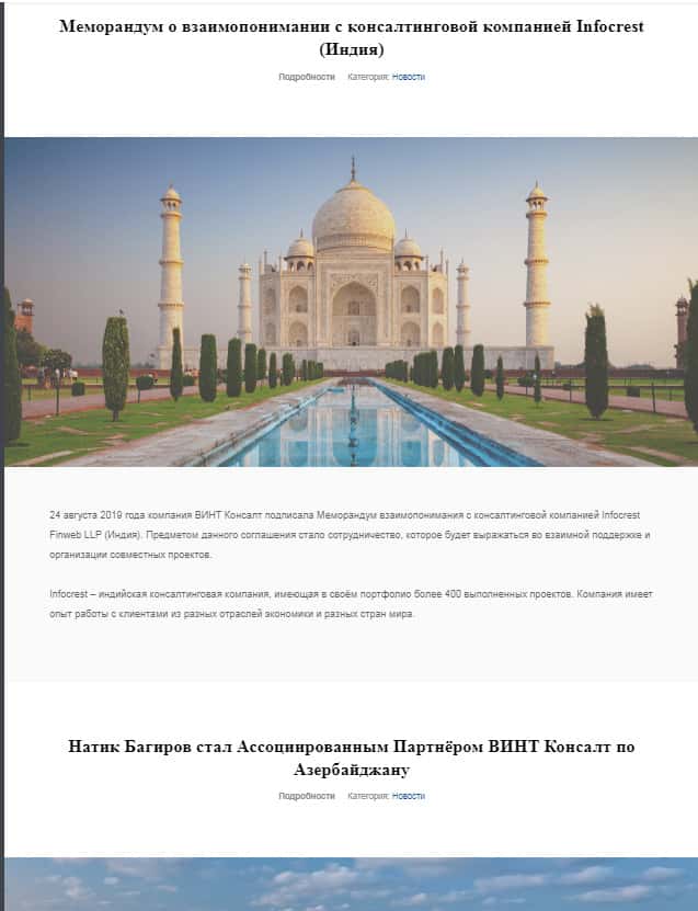 Официальный сайт ВИНТ Консалт сделан полностью для того, чтобы привлечь внимание неопытного пользователя сети, который не имеет даже представления, как должен выглядеть реальная консалтинговая компания. На изображении ниже можно увидеть, как мошенники VintConsult ловко подделывают свое наличие в различных новостях
