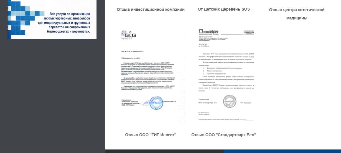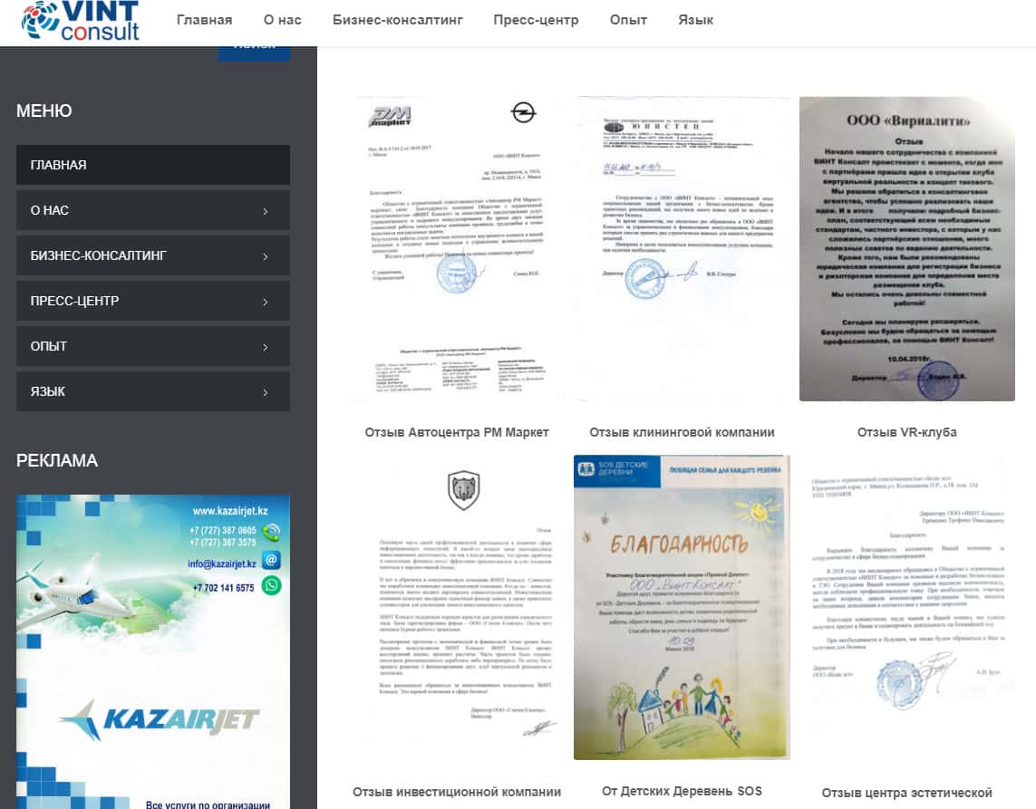 В связи с тем, что мошенники VintConsult ведут противозаконную деятельность, они на своем же официальном сайте мошенники решили подделать отзывы разных организаций, дабы внушить доверие наивной клиентуры, а затем стандартным путем, вешая лапшу дальше, обанкротить их.