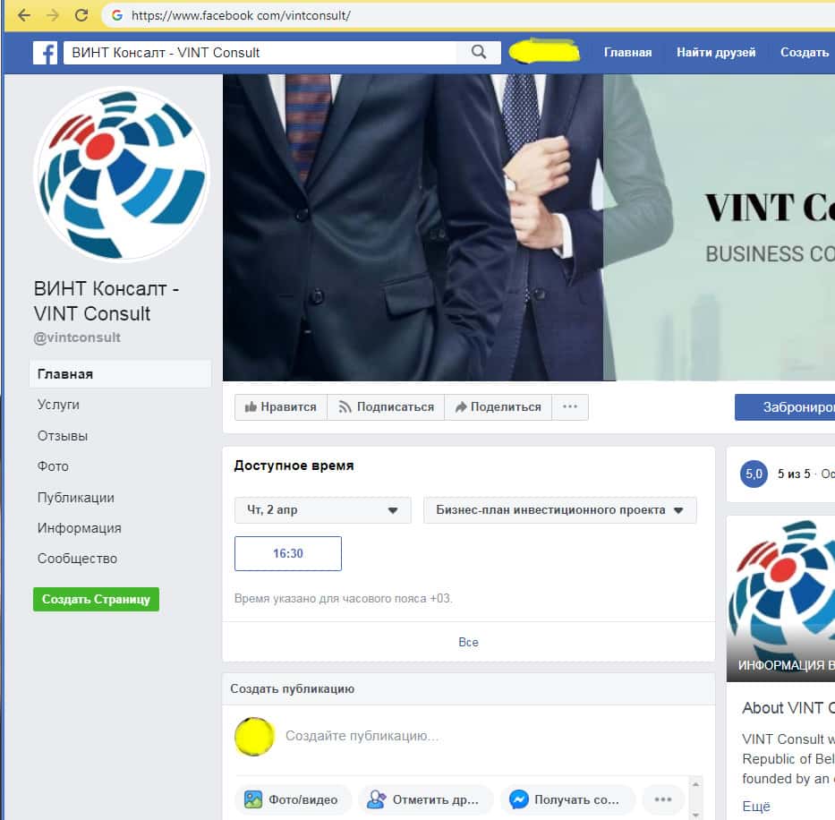 Для размещения различных заманчивых постов с лапшой на уши наивной клиентуре аферисты VintConsult обзавелись страницей в социальной сети Фейсбук, где у мошенников ВИНТ Консалт имеется несколько тысяч подписчиков. На изображении, расположенном ниже, вы можете увидеть страницу аферистов ВИНТ Консалт на площадке Facebook.