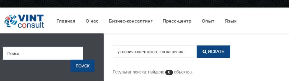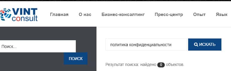 Политика конфиденциальности у аферистов VintConsult также, как и условия сотрудничество, не найдено. Мы провели поиск по официальному сайту с помощью встроенного поиска, но никакой информации найдено не было. Ниже на скриншоте вы можете увидеть отсутствие документа о политике аферистов ВИНТ Консалт.