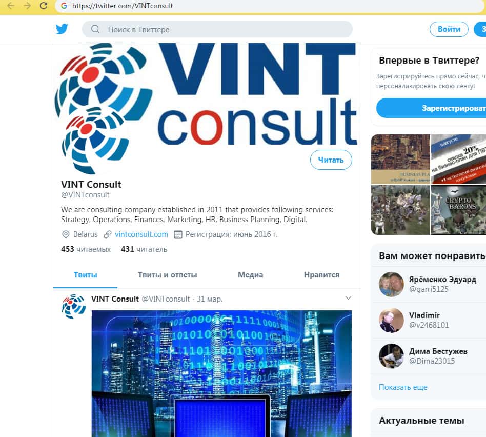 Кроме того, аферистов ВИНТ Консалт есть и страница в социальной сети Твиттер, где у шулеров VintConsult размещена довольно стандартная и типичная лапша на уши и накручено несколько тысяч подписчиков. На изображении, расположенном ниже, вы можете наглядно увидеть страницу аферистов VintConsult в социальной сети Twitter.