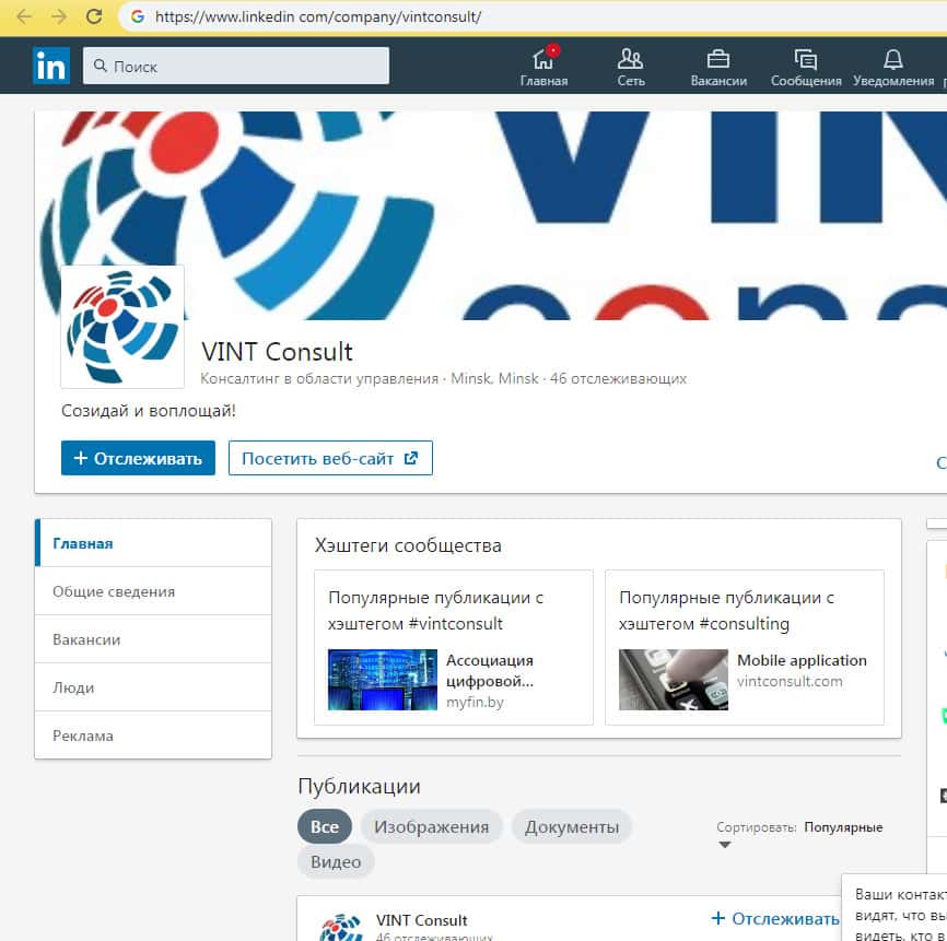 Дабы соответствовать современным трендам шулера ВИНТ Консалт создали себе страницы в социальных сетях, одной из которых является Linkedin, где у мошенников VintConsult имеется чуть более тысячи подписчиков. На изображении, расположенном ниже, вы можете увидеть внешний вид страницы проходимцев в социальной сети ЛинкедИН.