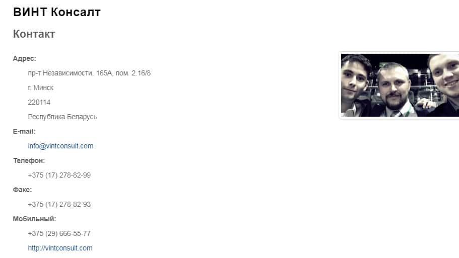Для того, чтобы выставить свои липовые контакты аферисты VintConsult отвели отдельный раздел на своем сайте, аферюги ВИНТ Консалт разместили свои контакты, дабы создать вид настоящей конторы, которая действительно хочет помочь клиентам в принятии решений по бизнесу.