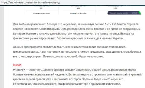 Портал antiobman com так же был взволнован деятельностью жуликов Винтон ФХ, в результате чего он опубликовал статью о жулье WintonFX в которой описал основные аспекты их мошеннической деятельности, по итогу которых портал антиобман ком определенно не рекомендует иметь дело с мошенниками Винтон ФХ, что вы можете наглядно увидеть на изображении ниже.