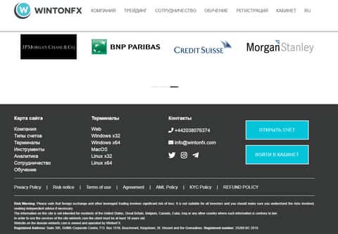 Завершается же сайт у аферистов WintonFX довольно стандартно и ожидаемо, а именно типичным меню со ссылками на различные разделы сайта мошенников Винтон ФХ, а так же предупреждением о рисках, в которых кухня WintonFX говорит о возможной потере клиентурой вложенных денег. На изображении, расположенном ниже, вы можете увидеть окончание сайта шулеров Винтон ФХ.