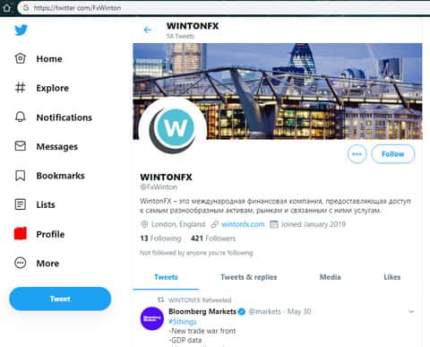 Дабы соответствовать современным трендам лохотрон WintonFX обзавелся страницами в различных социальных сетях, одной из которых стал Twitter, где аферисты Винтон ФХ имеют несколько сотен подписчиков, однако никакой их активности и так на малоактивном аккаунте у жуликов WintonFX не наблюдается, что вы можете наглядно увидеть на изображении, расположенном ниже.
