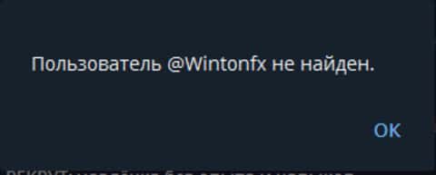 Ну а при попытке перейти на телеграм-канал, указанный на сайте лохотрона WintonFX попытка не увенчалась успехом, ведь данный пользователь попросту не был найден. Это говорит об определенной халтуре мошенников Винтон ФХ, или же их нежелании попросту заниматься и данным новостным источником, что вы можете наглядно увидеть на изображении ниже.